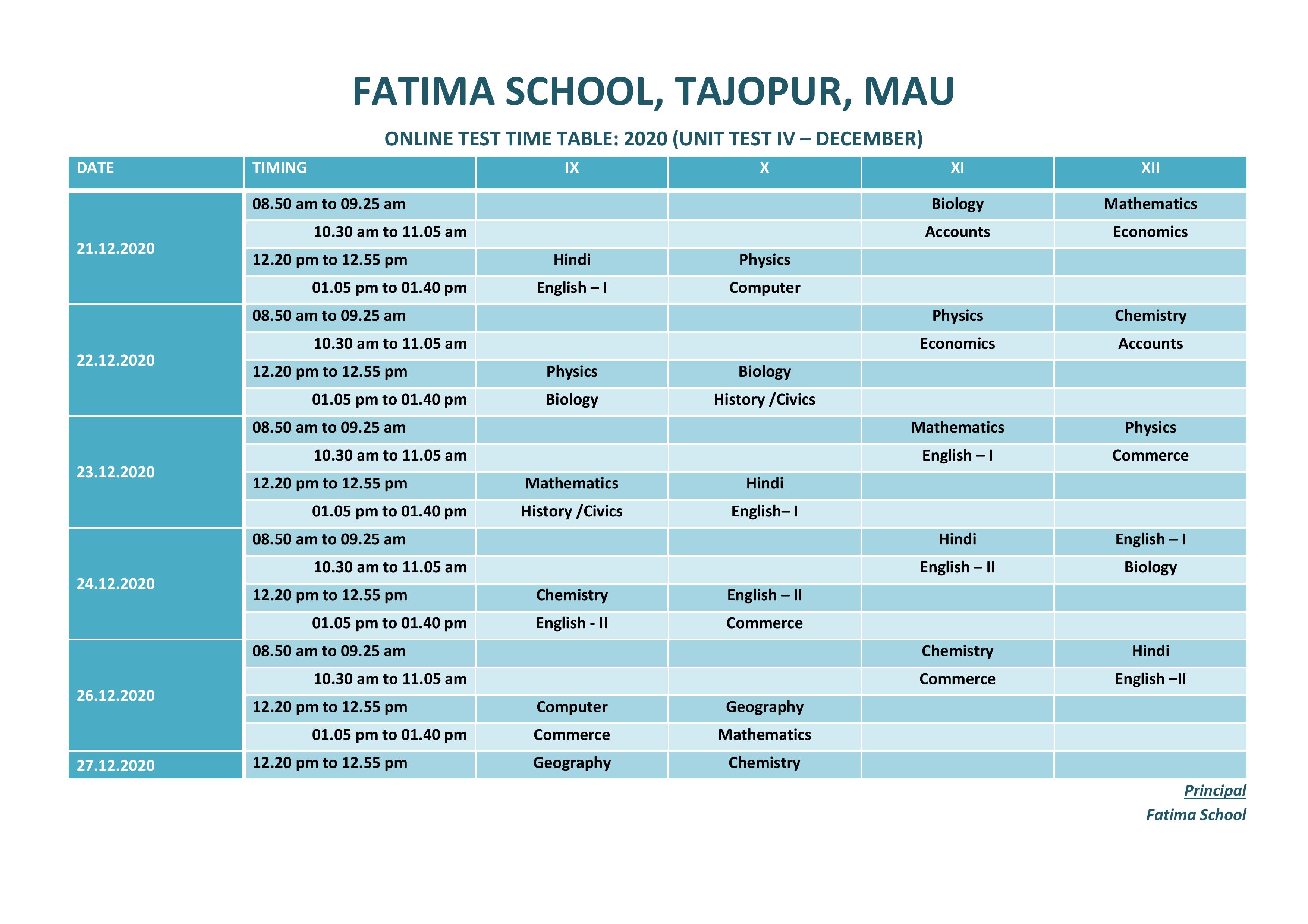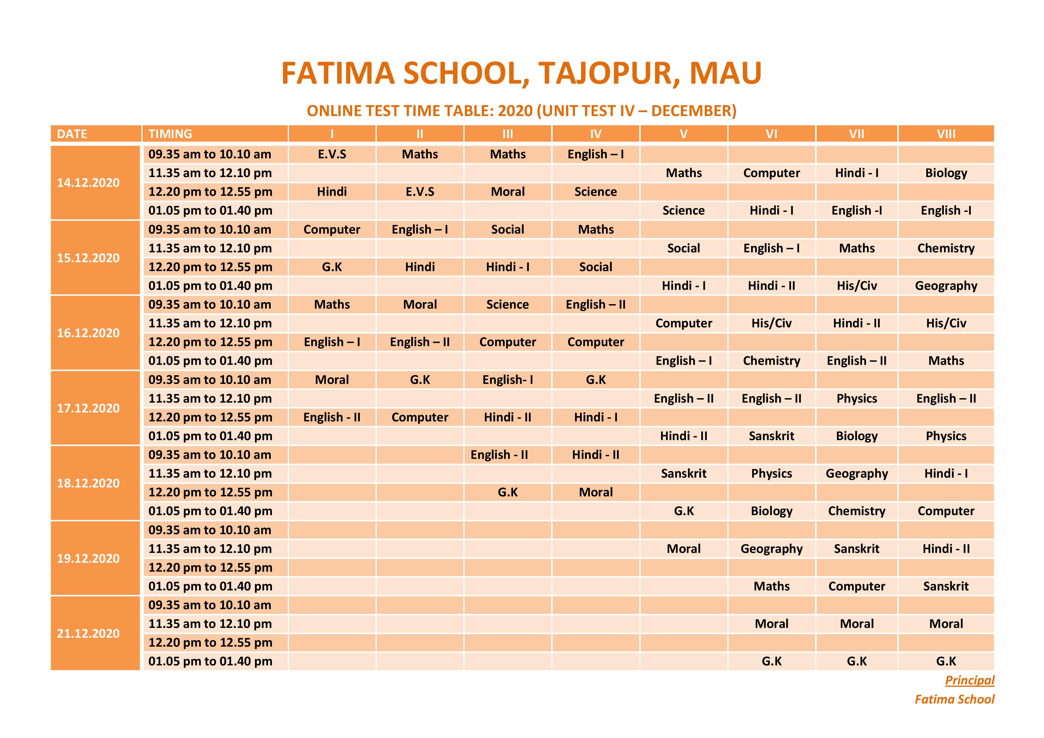 Time Table for UT-IV (Assessment _ Dec 2020) for Class IX to XII